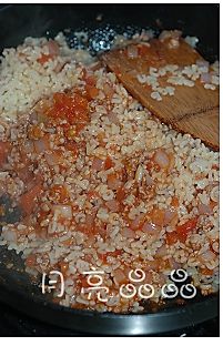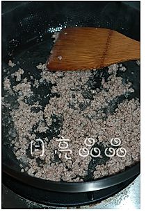 锅里放橄榄油,烧热后,把牛肉末煸炒至变色,盛出备用。