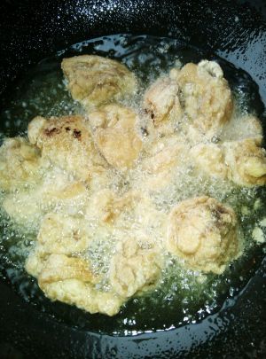 锅热放油,放入裹好生粉的鸡肉块小火炸制金黄