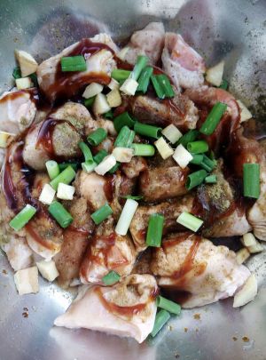 把鸡剁成块,依次放入黑胡椒、孜然粉、味极鲜、耗油、料酒、盐、生粉、葱、姜用手抓匀封上保鲜膜放在冰箱里腌制半天