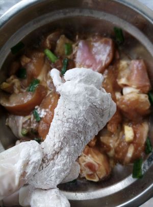 把腌制好的鸡肉裹上生粉