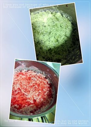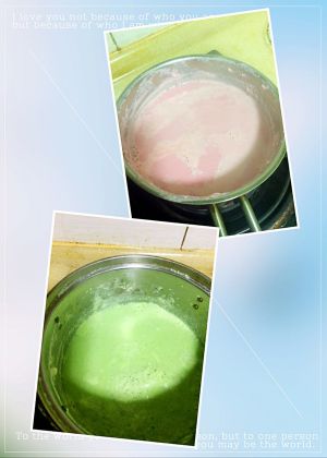 黄豆泡好平分两盆,分别加上300g清水,用原汁机分别加入火龙果、青菜叶磨出两锅彩色豆浆,期间仍须用漏布再过滤一次又将豆汁放入原汁机里磨一下,这样做出来的豆浆更细腻。