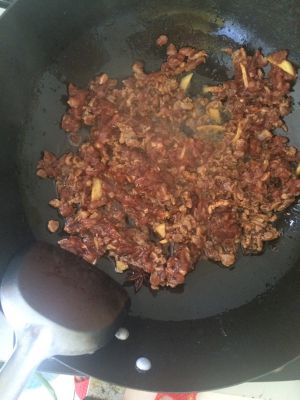 肉炒致变色放入葱白,炒几下,放入豆瓣酱