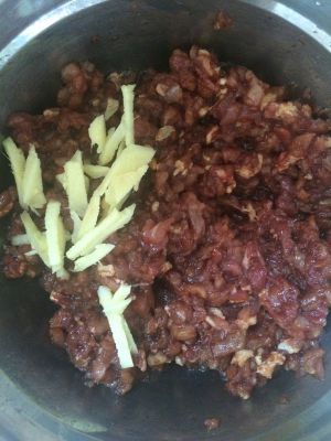 加料酒,生抽,老抽,少量,因为后面还要加酱。姜,香油,搅拌均匀