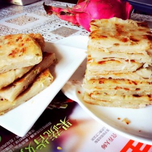 好了赶成圆饼,重复刚才,再铺一层油,撒少许葱花,再团,擀平成圆或方