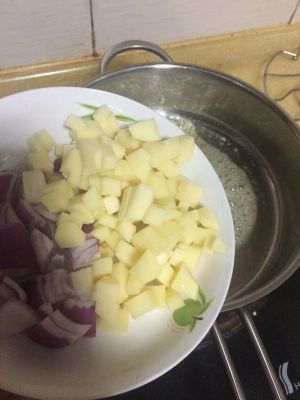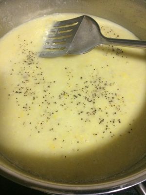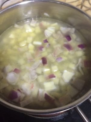将打碎的土豆汤汁又倒入锅内,小火慢熬。
