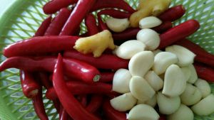 新鲜红椒去蒂洗净,控干水分,姜和蒜头去皮待用。