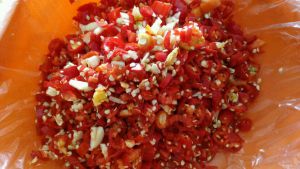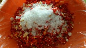 将剁好的辣椒粒、蒜蓉、姜沫加盐搅拌。