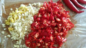 辣椒、姜、蒜切碎,姜、蒜尽量剁碎一些。