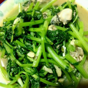 凉锅热油爆香姜片,下茼蒿炒至五分熟,倒入海蛎子,炒两分钟加盐出锅即可 。