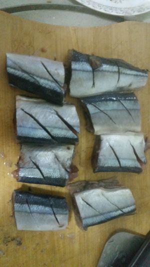 将秋刀鱼洗净去头,去尾。把鱼切成块状,划几道痕(以便腌制是入味)。