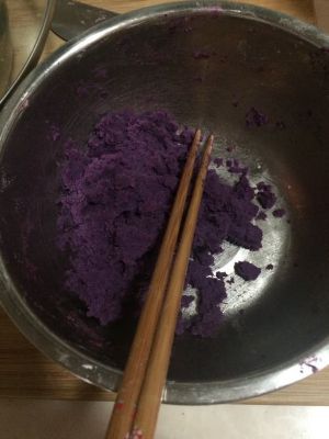 紫薯蒸熟后用叉子按碎,加入淡奶油、蜂蜜和糯米粉,搅拌均匀,备用