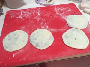 面团发好后,沾干粉再揉到光滑,揉完分了10个小面团,紫薯馅没分,凭着感觉包的,馅儿大点好吃,擀成饼,饧一饧