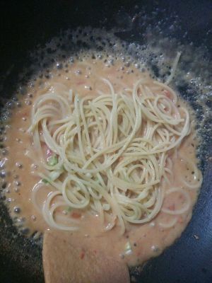 洋葱爆香后,加入西红柿,翻炒一会儿,加入刚刚打好的土豆泥和适量的水。煮开后,加入已经准备好的意面。