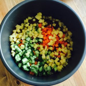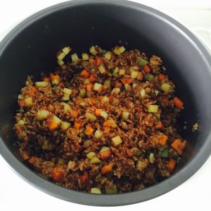 上面铺上之前准备好的蔬菜丁,按煮饭模式,和日常煮饭一样步骤,一般半小时左右,煮好保温模式闷十分钟。
