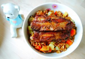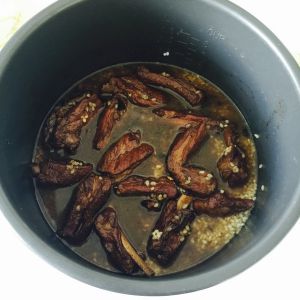排骨熬好后,把排骨连同汤一起倒入电饭锅,淘好的米提前放好,直接把排骨倒在上面即可,再加入一小碗清水,否则米粒会偏硬。