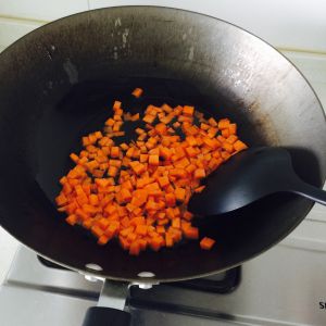 炒锅放入油,热了之后先把胡萝卜拌炒一下,因为胡萝卜素必须用油煸一下才出来,盛出备用。