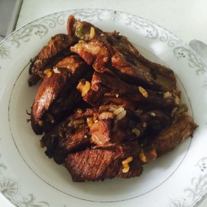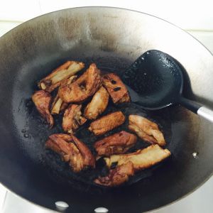 把排骨放入爆香的油锅内翻炒,然后加入料酒、生抽、糖拌炒一下。再撒入五香粉,加入老抽和适量盐(盐的量比日常炒菜略多一些)