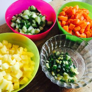 葱姜切末,胡萝卜、黄瓜、土豆切丁备用。米淘好备用。