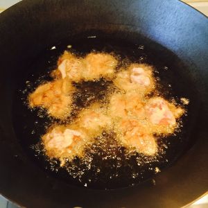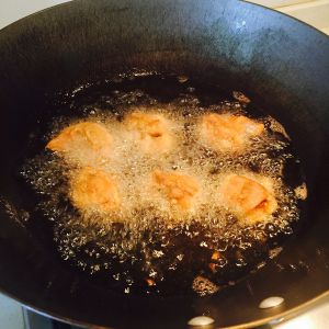 沾好后不要马上炸,等五分钟返潮。这样淀粉裹得更牢更脆。