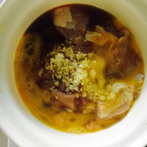 两瓣蒜切末,把鸡腿肉、蒜末、料酒两勺、鸡蛋、生抽两勺混合,鸡蛋打匀放入,揉捏一下。