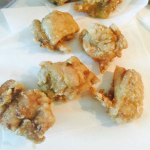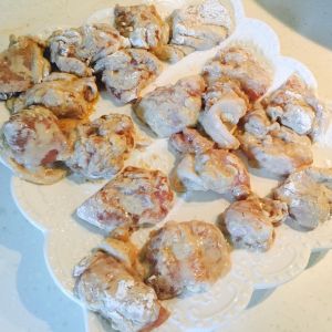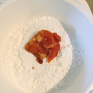 鸡块好了之后,拿出来轻轻沾上淀粉,不要用力,把里面的水分挤出。