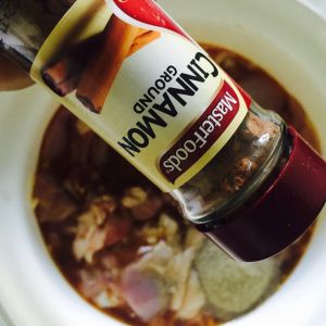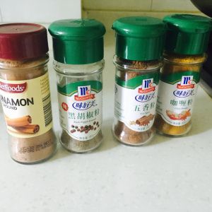 再放入胡椒粉2勺,肉桂粉2小勺,五香粉二分之一小勺,咖喱粉二分之一小勺,糖一勺,盐一小勺。这里的小勺就是平时调料的小勺,所谓的勺子就是茶匙。