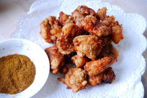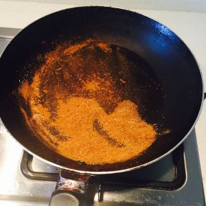 将这几个香料和盐各取一小勺,小火炒一下,闻到有点呛鼻的味道出来就可以了。等下撒到鸡块上。我建议宝宝吃的话可以不用撒,胡椒粉有点辣。