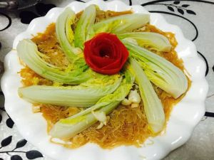 摆盘,下面放粉丝,上面放娃娃菜,隔水蒸熟。