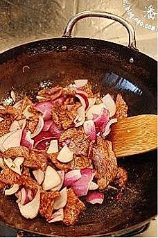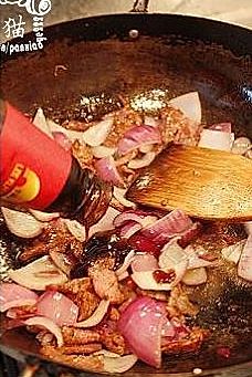 开始烹饪,锅热后倒入2勺油。先放入姜末爆香后放入葱末都爆出香味后放入腌好的牛肉片,牛肉片外表变色后放入洋葱翻炒。