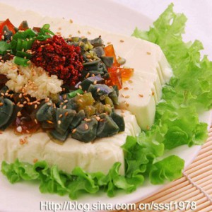 将作料3混合调成味汁,浇在皮蛋豆腐上