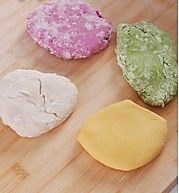 然后四个颜色分别放入容器里,各加少许盐,然后各加125g面粉,揉成非常硬的四色面团。