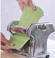 绿色面团先用手稍微按扁,然后面条机1档来回折叠,压面,直到面皮非常光滑。(其他颜色同上)
