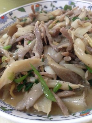 然后下肉丝,翻炒两下肉丝变色马上下平菇和青椒(前面忘记说了,平菇一定要把水倒干,要不炒的时候水会很多)