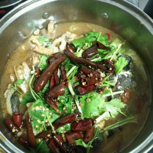 锅中放入油,大火热锅,加入一半的花椒,麻椒和辣椒干,小火炒香,放入豆瓣酱三大勺,翻炒,加入姜葱,鱼头鱼尾,鱼骨,翻炒几分钟。