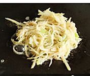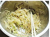 准备好材料,土豆刨丝,加入盐小葱腌制几分钟;