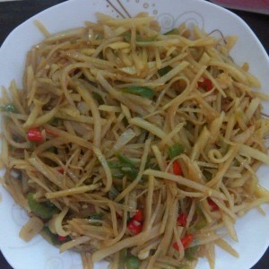 在将土豆丝倒入锅内一起翻炒,加入盐,酱油,醋,放少量水一起翻炒。
