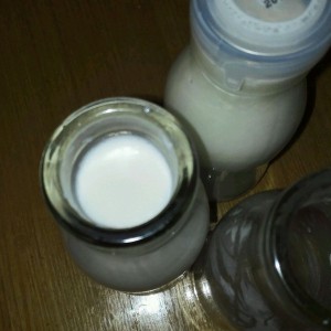 把酸奶打开,分别倒入三个空瓶中,我是这一瓶分成四份