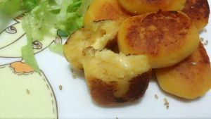 芝士粉糯米粉蛋黄酱倒入薯泥揉成面团,略微的放一会