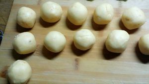 分成小份里面包上撕碎的芝士片,团成球