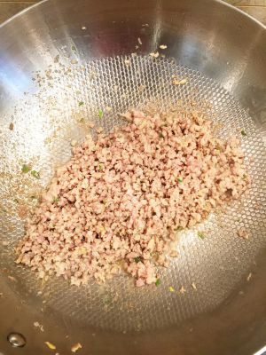 锅内入油,姜葱蒜爆香后入肉糜炒至变色,盛出备用