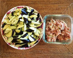 茄子切滚刀块,前腿肉搅成肉沫,姜蒜葱切碎