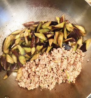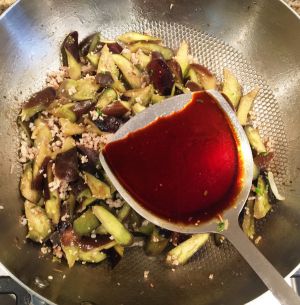 将肉沫倒入茄子中一起煸炒,再入一些水保证有汤汁,等会我们就要调味了。