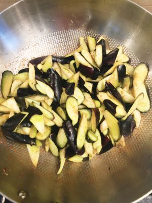 锅内再入适量油,将茄子下锅煸炒,锅里的油很快就被茄子吸光了,此时分次慢慢在锅内撒入一些水,将茄子炒的软塌