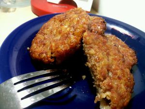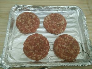 用做肉圆的手法将绞肉馅在手中来回丢扔成较平滑的球形以后放在锡纸烤盘上用手压成直径约9cm,高度约1.3cm左右的肉饼,并保证肉饼中间高度略低于周边,因为烤的时候肉饼中间会鼓起来,太多肉容易裂开