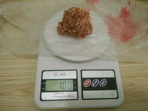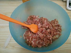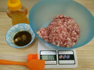 电子秤上垫上薄纸或者塑料袋,每次称量100g的拌好的绞肉