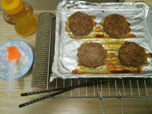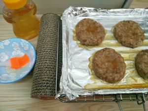 送入烤箱中下层180℃烤20分钟后取出,蜂蜜倒入小碗,用硅胶刷在肉饼表面刷上薄薄的一层,再放入烤箱上层200℃烤15分钟上色