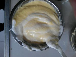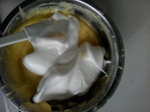 取1/3打好的蛋白放入蛋黄液中搅拌均匀!要上下翻!