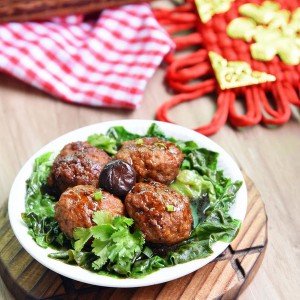 生菜焯熟铺在盘子上面,放入肉丸子,而锅里剩余的汁料加入水淀粉,煮沸后浇在肉丸子上面