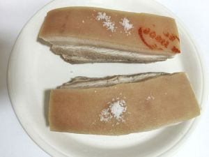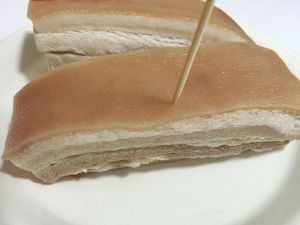 捞出肉洗干净,拔去杂毛,刮去杂质。用竹签在肉皮上扎小洞,越密集越好。