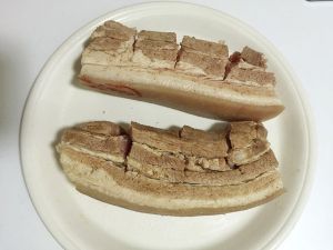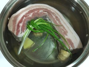 五花肉洗净,放葱姜,冷水下锅,煮至按压时没有血水流出,约7成熟。